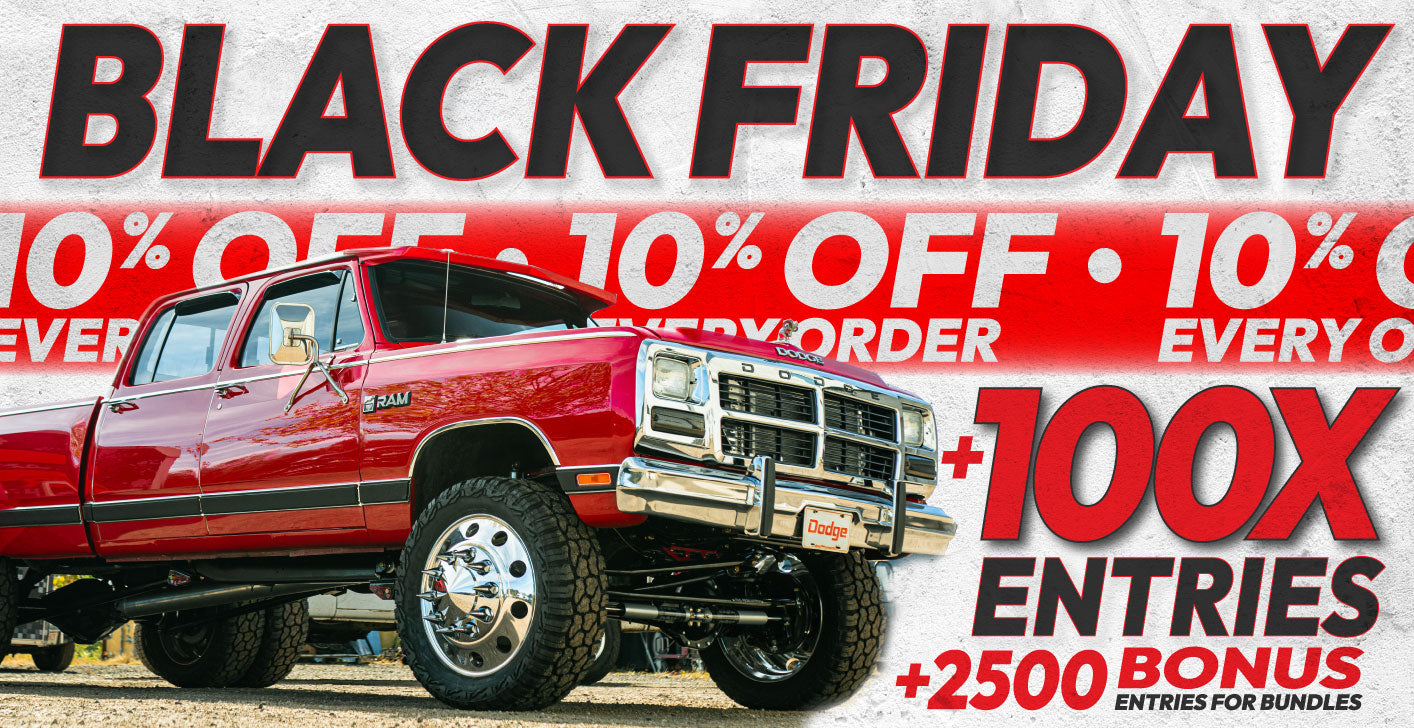 Every purchase earns entries toward a fully built 1984 Dodge D350 4×4 with a Cummins swap and $10,000 cash. Weekly multipliers boost your odds, and winners are chosen at random once the giveaway ends. See official rules for specific details.