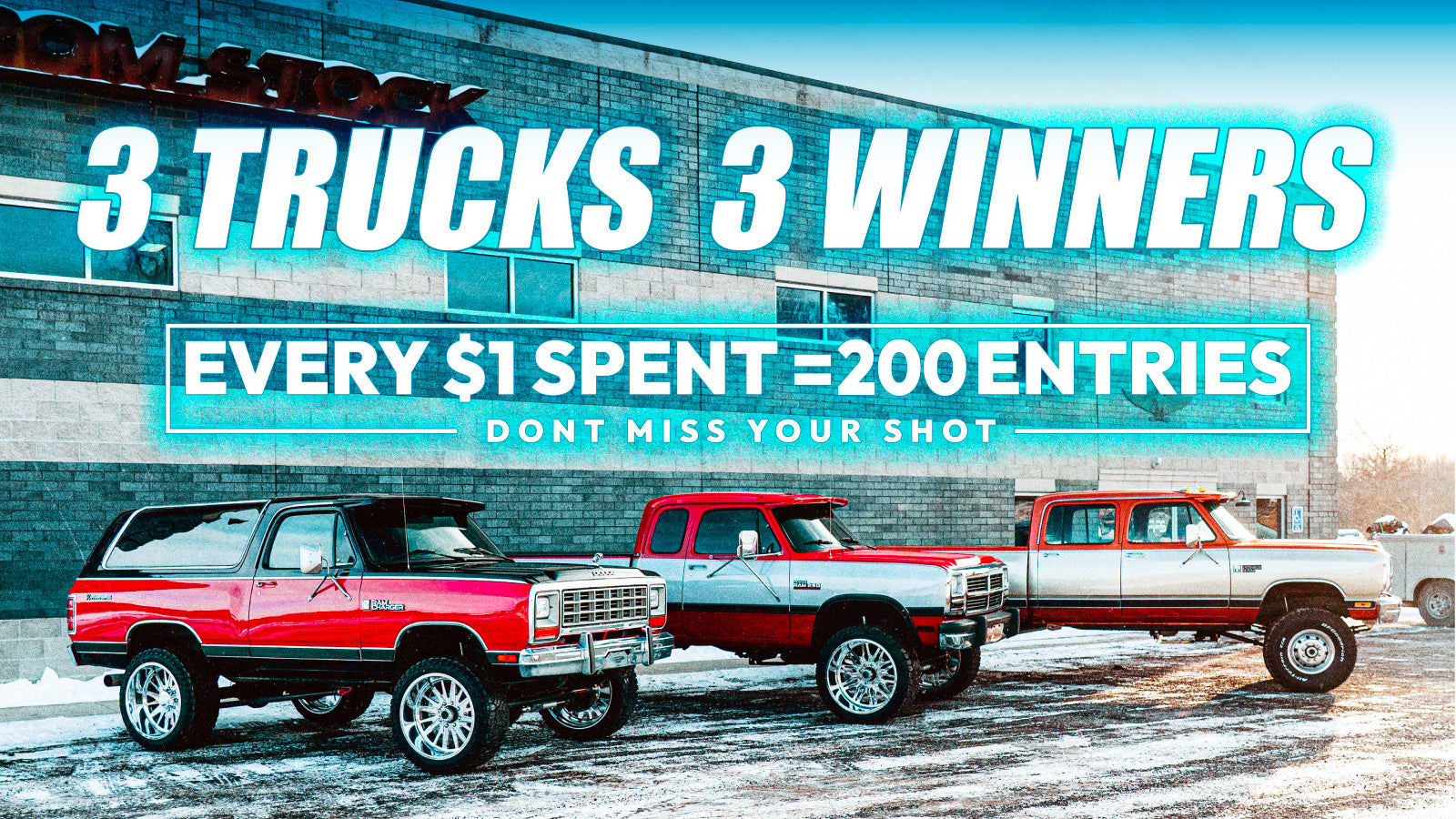 FFSG3 & FFSG4 ARE LIVE — and this one’s massive. Every order now enters you for three legendary Dodges: a fully built 1984 Ramcharger + $10,000 cash and a 1993 W250 + $10,000 cash, 1983 W350 Crew Cab Dually 12v Cummins +$10,000 CASH. Three trucks. Three cash prizes. Three will win!